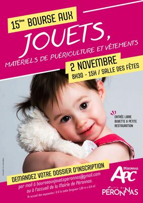 Bourse aux jouets, vêtements et matériels de puéricultures. De 8h30 à 15h à la salle des fêtes - 450 rue de la grange magnien 01960 péronnas. Plus de 50 exposants. Pré-dossier d'inscription à demander par mail : voir sur l'affiche
