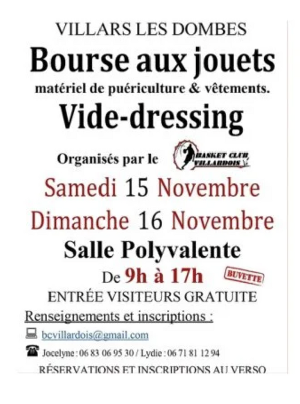 L’association du basket club villardois organise une bourse aux jouets, matériel de puériculture, vêtements, jouets les 15 et 16 novembre à la salle polyvalente de 9h à 17h.