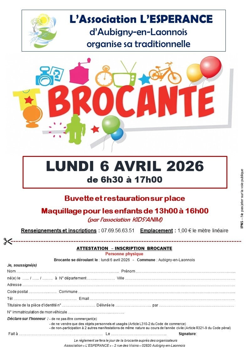 Brocante lundi pâques avec petite restauration (barbecues /frites) salle des fêtes.Jeux pour petits et grands, tombola, animation gratuite (maquillage enfant à partir de 3ans par une professionnelle) de 13h à 16h.