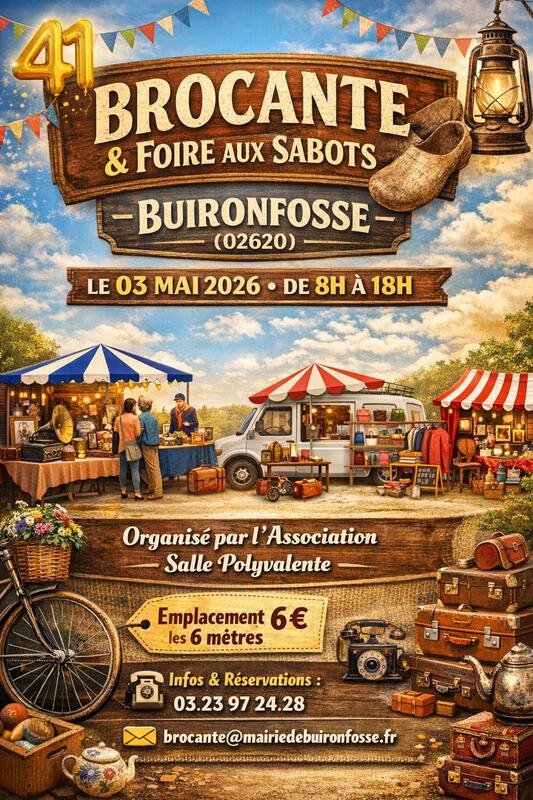 Brocante, vide-greniers - brocante, vide-greniers - 41ème année - 300 exp - 1 jour(s) - de 08h00 à 18h00 - extérieur, toilettes, animations, buvette, restauration sur place, exposants en alimentaire refusés - association salle polyvalente -(heure de bureau) centre ville - arrivée entre 6h et 8h - - dimanche 03 mai 2026 de 08h00 à 18h00 (notre 41ème brocante et foire aux sabots aura lieu le 03 mai 2026, de 8h à 18h dans les rues du centre du village de buironfosse