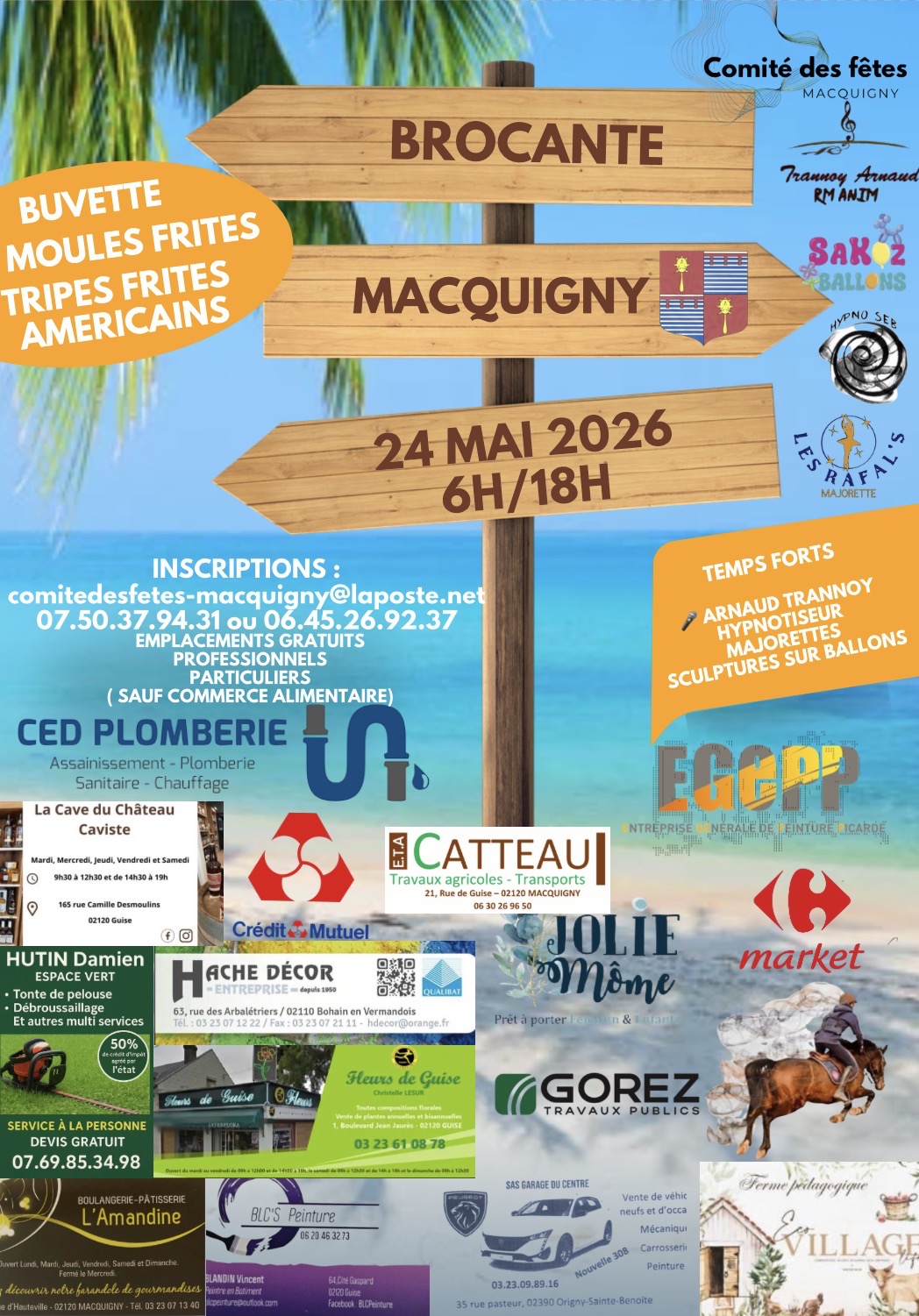 Notre brocante se déroulera à macquigny (rue flacon, rue du four, rue de la gare), le 24 mai 2026 de 6h00 à 18h00.