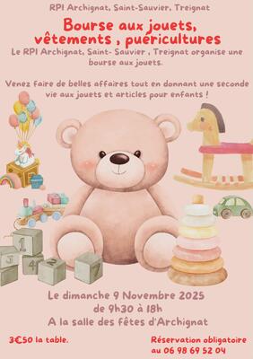 Bourse aux jouets vêtements articles de puériculture organisé par l'amicale des parents d'élèves du rpi archignat st sauvier treignat.