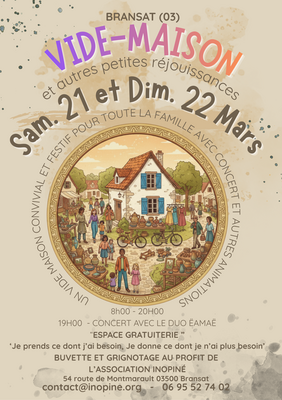 Vide-maison & réjouissances : le rendez-vous où vos futurs coups de cœur attendent de changer de mains ! Vous savez, ce petit buffet qui ne demande qu'une nouvelle cuisine pour briller ? Ou cette lampe vintage qui a manifestement besoin de voir du pays ? À bransat, on a décidé de leur offrir une seconde vie, et on fait ça avec style ! Les samedi 21 et dimanche 22 mars, on ouvre grand les portes (et les placards) pour un vide-maison pas tout à fait comme les autres. Ici, on ne vend pas juste des objets, on cultive la convivialité et la bonne humeur. Au programme de ces deux jours : chiner malin : de 8h00 à 20h00, venez débusquer la perle rare, l'objet insolite ou le meuble qui manquait à votre salon. Promis, il n'y a pas de fantôme dans les armoires, juste de bonnes affaires ! L’espace gratruiterie : parce que le bonheur est encore meilleur quand il est partagé. Le concept ? "je prends ce dont j’ai besoin, je donne ce dont je n’ai plus besoin". C'est fluide, c'est généreux, et ça fait du bien à la planète (et au moral). Musique et vibrations : le samedi à 19h00, on pose les cartons pour écouter le duo ëamaë. Un concert pour finir la journée en beauté et entamer quelques pas de danse entre deux bibelots. Buvette & grignotage : une petite soif après avoir négocié le prix d'un vélo ? Notre espace restauration est là pour vous requinquer. En plus, tous les bénéfices vont à l’association inopiné. C’est donc officiellement une bonne action que de reprendre une part de gâteau ! Infos pratiques où ? 54 route de montmarault, 03500 bransat. Quand ? Samedi 21 et dimanche 22 mars, de l'aube (enfin, 8h) au crépuscule. Contact : |venez avec votre plus beau sourire, vos sacs réutilisables et votre curiosité. On a hâte de vous voir pour transformer ce grand ménage de printemps en une fête mémorable !