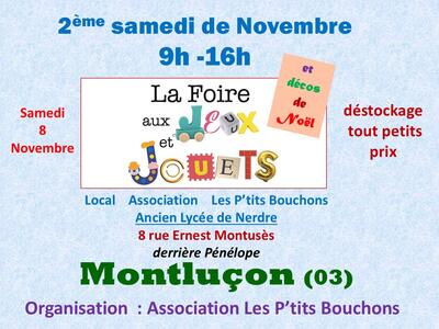 L' association les p'tits bouchons propose sa 14 ème foire aux jouets et jeux et décos de noël, le deuxième samedi de novembre, soit le samedi 8 novembre de 9h à 16h dans son local 8 rue ernest montusès, à montluçon, ancien lycée de nerdre, dans la cour derrière pénélope, avec vaste parking, vous pouvez donc y accéder en voiture. C'est une vente à tout petits prix d'un gros stock accumulé lors de l'année écoulée par notre association.