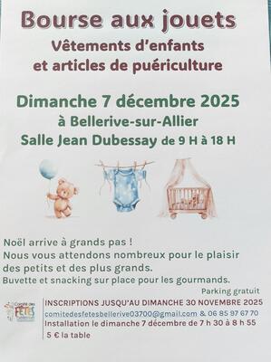 Le comité des fêtes de bellerive vous invite à participer à sa bourse aux jouets en tant qu'exposants ou visiteurs. Deux salles d'exposants, de nombreuses affaires à faire. Buvette, crêpes et snacking pour vous restaurer.