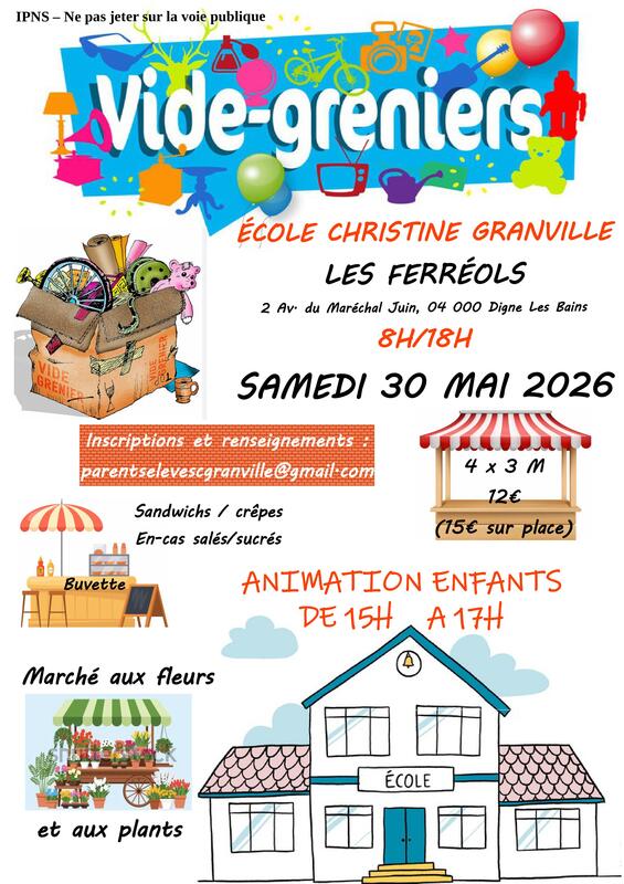 Vide grenier et marché aux fleurs/plants au profit de l'école C.Granville les ferréols digne buvette et petite restauration sur place animations enfant l'après-midi stand 4x3m: 12 euros en pré-réservation et 15 euros sur place inscriptions par mail :