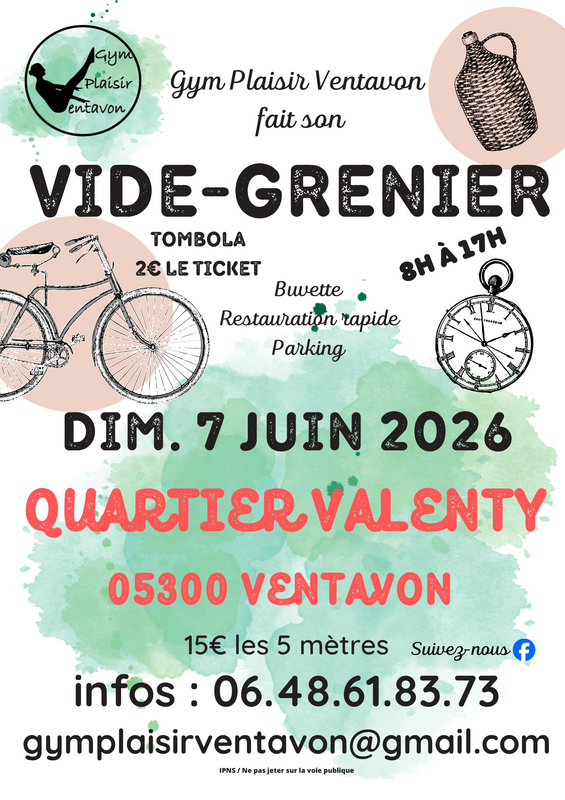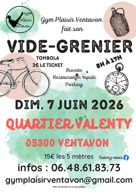 Emplacement : 15€ les 5 m linéaires, (par tranche de 5 m minimum). Fiche d’inscription à remplir et à envoyer avec le règlement à l’association gym plaisir ventavon (voir sur la fiche d’inscription). Merci de demander la fiche d’inscription par mail. Ouverture exposants 6h, ouverture visiteurs 8h. Attention, toutes inscriptions incomplètes ne seront pas prises en compte. Il n’y aura pas de remboursement en cas de désistement ou d’absence à l'événement.