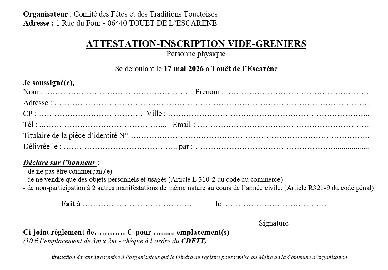 Le comité des fêtes et des traditions touëtoises organise un vide-greniers le dimanche 17 mai sur la place de l’église.