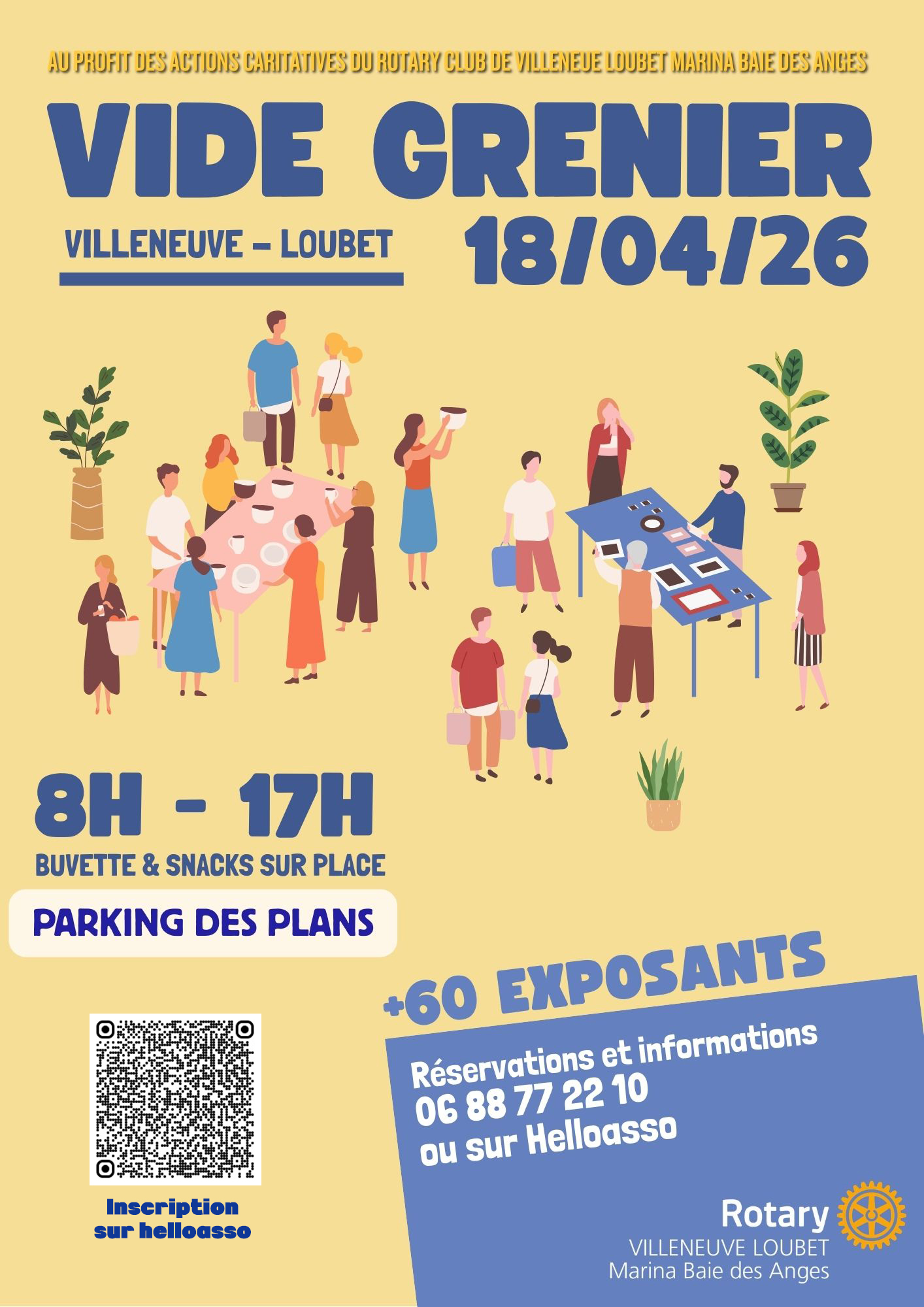 Un vide grenier organisé par le rotary club de villeneuve loubet marina baie des anges , dont les profits seront reversés au profits des écoles élémentaires et maternelles de la commune de villeneuve loubet .