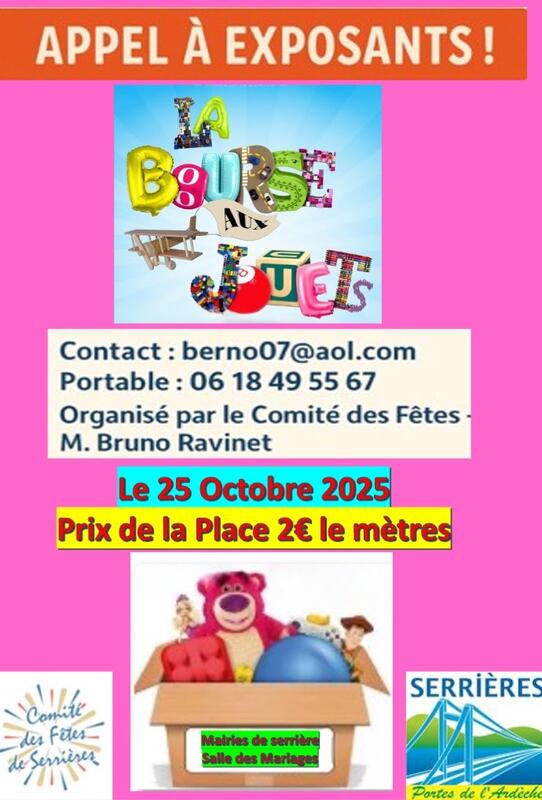 dans la salle des mariages de la mairie de serrières , organisation par le comité des fêtes d’une bourse aux jouets. Installation à partir de 8h00. Apportez tous les jouets ou jeux en bon état et venez les vendre dans le cadre de la préparation des fêtes de noël.