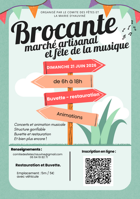 le comité des fêtes de hauviné organise sa brocante annuelle le dimanche 21 juin 2026 dans les rues du village.