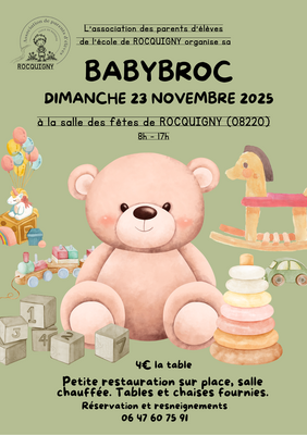 L'association des parents d'élèves de l'école de rocquigny (ecole du ruisseau) organise sa babybroc en ce dimanche 23 novembre 2025. Salle des fêtes chauffée, petite restauration sur place.