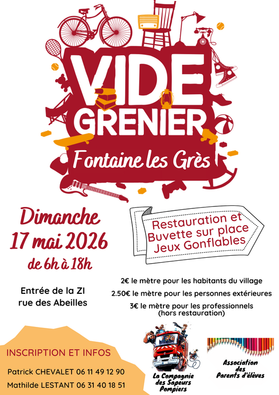 L'amicale des pompiers et l'association des parents d'élèves de fontaine les grès organise son vide grenier le dimanche 17.05.2026 de 6h à 18h