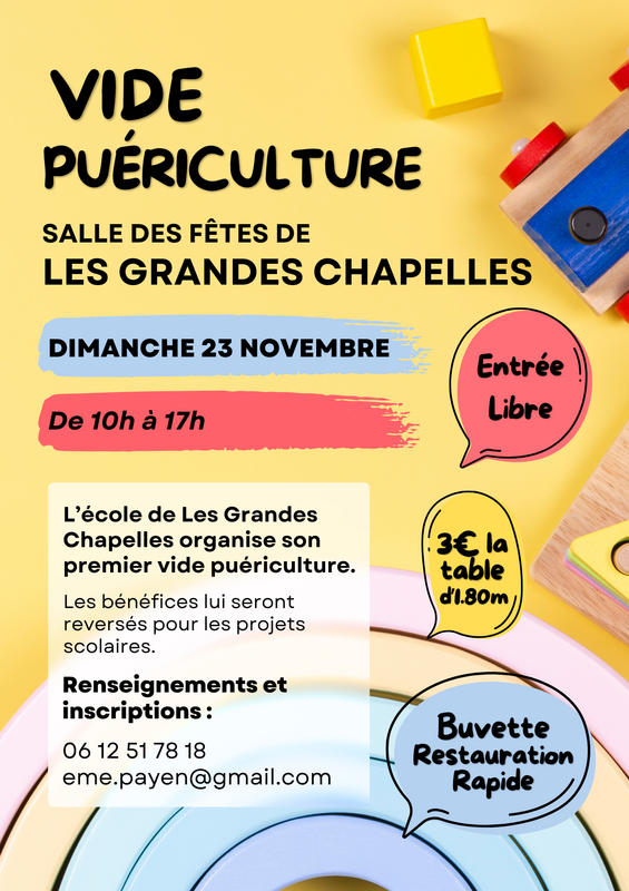 L'école de les grandes-chapelles organise son premier vide puériculture. Les bénéfices seront reversés à l'école pour financer les projets à venir avec les élèves.