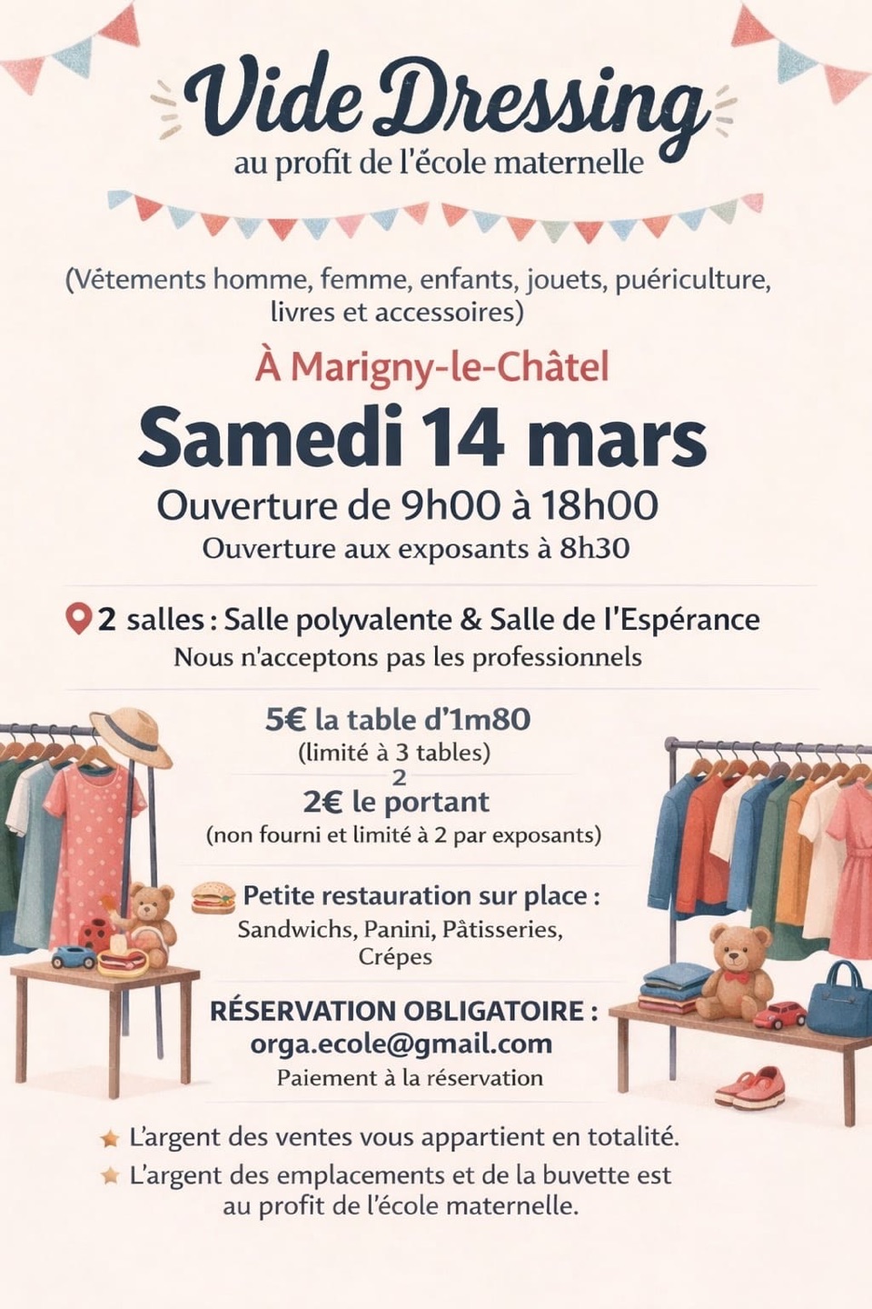 Vêtements homme, femme et enfant, en puériculture, jouets, livres et accessoires de mode dans les deux salles des fêtes. Ouverture au public de 09h à 18h. Petite restauration sur place (sandwichs, panini, pâtisseries et crêpes). Le bénéfice des emplacements et de la buvette contribuera à l'achat de matériel et de sorties pédagogiques pour l'ensemble des élèves de maternelle.