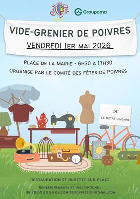 Vide grenier de poivres – vendredi 1er mai 2026 ! Le comité des fêtes de poivres vous donne rendez-vous pour une journée conviviale lors du vide-grenier de poivres ! Vendredi 1er mai 2026 place de la mairie – poivres de 6h30 à 17h30 venez chiner, vendre, ou simplement profiter de l’ambiance ! Objets anciens, vêtements, déco, bonnes affaires… il y en aura pour tous les goûts. Tarif exposant : 1€ le mètre linéaire restauration et buvette sur place pour passer un moment agréable en famille ou entre amis. Renseignements et inscriptions dès maintenant