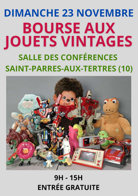 En attendant l’affiche de notre prochaine exposition des jouets de notre enfance, qui se tiendra en mars prochain, nous avons décidé, avec quelques amis, d’organiser une bourse aux jouets vintage dans la petite salle de saint-parres-aux-tertres, le dimanche 23 novembre