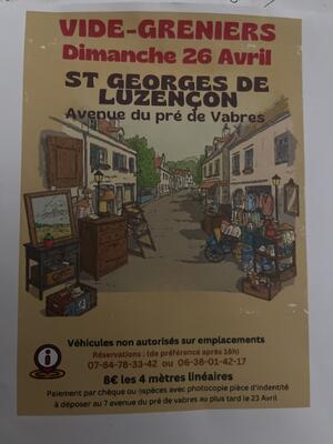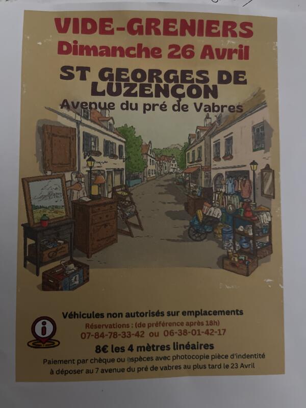 8€ les 4 mètres on les voitures ne peuvent pas rester derrière les stands du coup des parkings à proximité sont à votre disposition . Paiement chèque à l ordre du comité des fêtes de st -georges de luzencon et à déposer avant le 23 avril au 7 avenue du pré de vabres ( chez mr me martini ) arrivée 7h ( nous serons là pour vous accueillir ) ne pas rentrer dans la rue avant la pose des barrières de sécurité ,départ max 17 h car reprise de la circulation , merci de prendre vos poubelles et de laisser propre votre emplacement réservation par téléphone,,