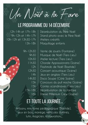 De 9h à 18h, retrouvez plus d’une trentaine d’artisans et commerçants locaux, des animations toute la journée, un flashmob, un teaser 100% farenc, et surtout… toute la magie des fêtes dans nos rues illuminées.