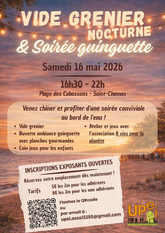 L’association upei organise un vide grenier convivial et familial le samedi 16 mai, de 16h30 à 22h, sur la plage des cabassons à saint-chamas. Dans une ambiance guinguette au coucher du soleil, exposants et visiteurs pourront profiter d’une soirée animée avec concert live, buvette et planches gourmandes, coin jeux pour enfants et atelier et jeux « 8 vies pour la planète ». Installation à partir de 15h (placement par l’organisation). Nous avons hâte de vous accueillir !