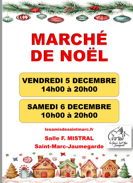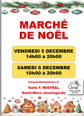 Les amis de saint-marc ne dérogent pas à la tradition et vous proposent le marché de noël le vendredi 5 décembre l'après midi à partir de 14h et toute la journée du samedi 6 décembre, de 10h à 20h.