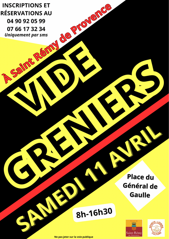 Ouverture à partir de 6h pour les exposants et 8h pour les visiteurs jusqu’à 16h30. Pour s'inscrire, communiquer par mail, téléphone ou directement sur place à l'association sports loisirs culture, place du général de gaulle, 13210 saint rémy de provence, avant le 10 avril 2026 : votre nom, prénom, numéro de téléphone ainsi que le nombre de place souhaité. Penser à avoir sur vous la photocopie de votre carte d'identité ainsi qu'un règlement de 15€ par emplacement, paiement, soit par chèque à l'ordre de l'association sports loisirs et culture, soit en espèce.