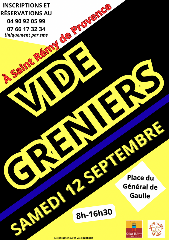 Ouverture à partir de 6h pour les exposants et 8h pour les visiteurs jusqu’à 16h30. Pour s'inscrire, communiquer par mail, téléphone ou directement sur place à l'association sports loisirs culture, place du général de gaulle, 13210 saint rémy de provence, avant le 11 septembre 2026 : votre nom, prénom, numéro de téléphone ainsi que le nombre de place souhaité. Penser à avoir sur vous la photocopie de votre carte d'identité ainsi qu'un règlement de 15€ par emplacement, paiement, soit par chèque à l'ordre de l'association sports loisirs et culture, soit en espèce.