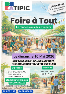 Foire à tout - dimanche 10 mai 2026 information exposants : ouverture dès 6h00 - réservation 2 mètre minimum par emplacement - réservation 5 mètres minimum pour une voiture - pas de professionnel de l'activité - pas de stand alimentaire paiement lors de l'inscription, se munir : - d'une pièce d'identité - d'un justificatif de domicile de moins de 3 mois - remplir l'attestation sur l'honneur information : 3,50€ le mètre.