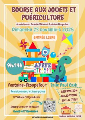 Dimanche 23 novembre 2025 fontaine-étoupefour (14790) bourse aux jouets - bourse aux jouets, vêtements enfants et puériculture - 10ème année - 50 part - 1 jour(s) - salle paul cash - de 09h00 à 14h00 - réservation obligatoire, couvert, salle chauffée, toilettes, accès handicapés, buvette, exposants en alimentaire refusés - 8 € la table de 1,80 m - apefe 6 impasse du stade jules quesnel - salle des fêtes paul cash - 7h pour l'heure d'arrivée des exposants et placement libre selon les arrivées -dimanche 23 novembre 2025 de 09h00 à 14h00 (entrée libre)