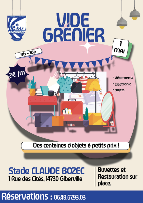 Bonjour, l'as giberville football organise son premier vide grenier le vendredi 01 mai 2026 de 8h à 18h.