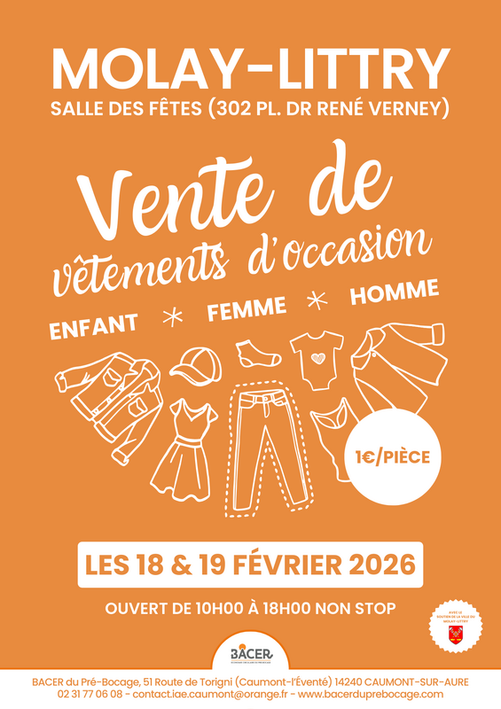 À noter dans vos agendas ! Rendez-vous les mercredis 18 & jeudi 19 février au molay-littry pour une grande vente de vêtements d'occasion organisée par la bacer du pré-bocage, avec le soutien de la commune du molay-littry !