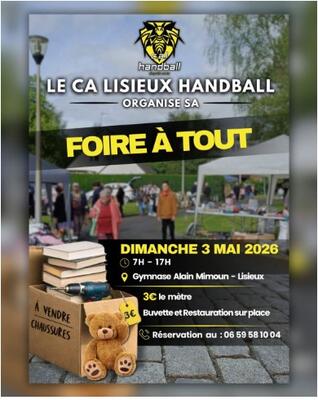 Le ca lisieux handball organise sa traditionnelle foire à tout au profit du club, autour du gymnase alain mimoun, buvette et restauration sur place