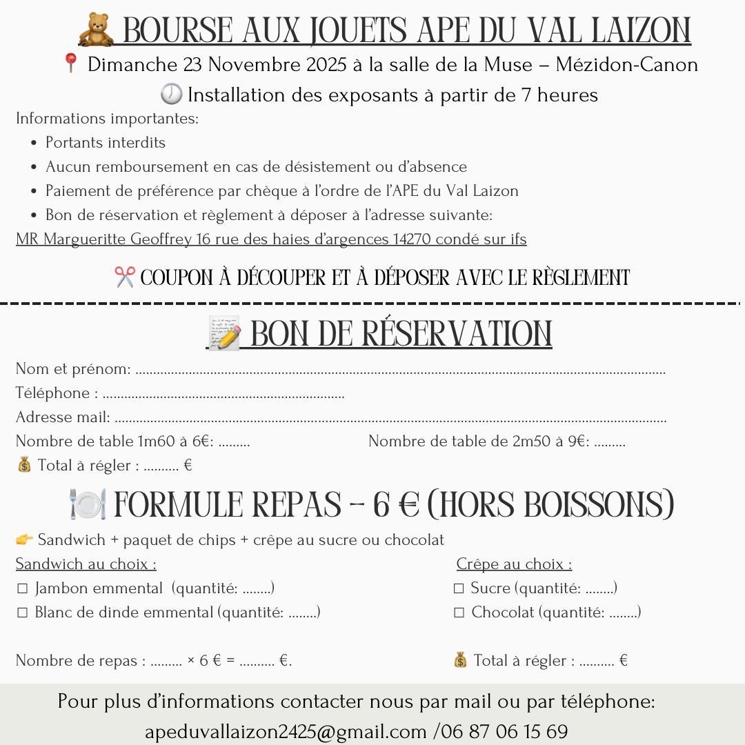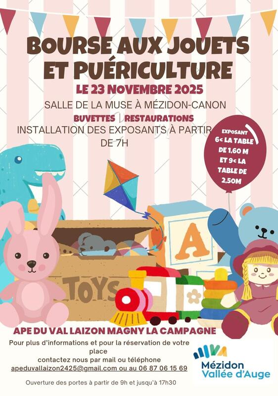 Ape du val laizon - école de magny-la-campagne organise sa première bourse aux jouets et puériculture dans le but de récolter des fonds et ainsi participer au financement des sorties scolaires, du matériel pédagogique et fête de l’école. Cette bourse aux jouets aura lieu dimanche 23 novembre 2025 à la salle des fêtes de la muse à mézidon-canon. De 7 h à 17 h 30 pour les exposants et à partir de 9 h pour les visiteurs.