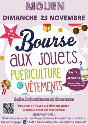 - inscriptions via hello asso (faire copier coller) => https://www.helloasso.com/associations/association-mouen-enfants-parents/evenements/bourse-aux-jouets-et-a-la-puericulture-2025 ou bien scanner le qrcode sur l'affiche