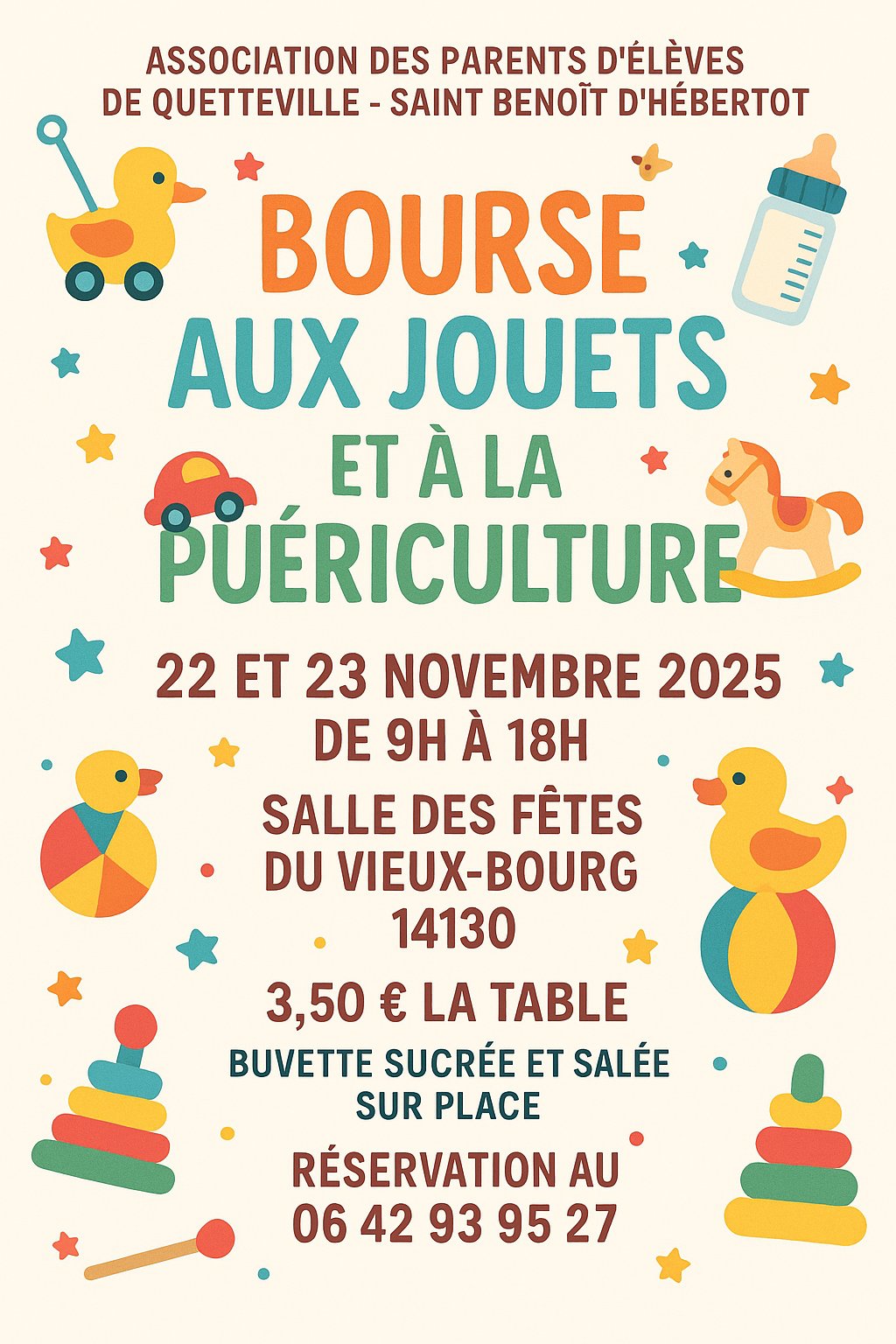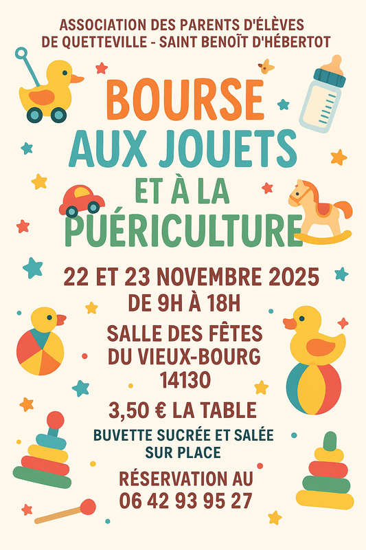 Bourse aux jouets & puériculture – 22 et 23 novembre 2025 organisée par l'ape de quetteville saint benoit d'hebertot. Vous avez des jouets, jeux, livres, vêtements enfants ou articles de puériculture que vos petits n’utilisent plus ? C’est le moment idéal pour leur donner une seconde vie tout en faisant plaisir à d’autres familles ! Devenez exposant ! Profitez de cette belle occasion pour : vider vos placards avant les fêtes rencontrer d’autres familles dans une ambiance conviviale gagner un peu d’argent tout en participant à un événement local et solidaire dates : samedi 22 et dimanche 23 novembre 2025 lieu : salle des fête du vieux bourg 14130 vieux bourg horaires d’installation et d’ouverture au public : 9h/18h infos exposants : tables et chaises fournies (dans la limite des places disponibles) tarif emplacement : 3.50€ la table 1m20 inscriptions et renseignements : /rejoignez-nous pour un week-end chaleureux, pratique et festif où chaque objet trouve une nouvelle vie et chaque sourire compte