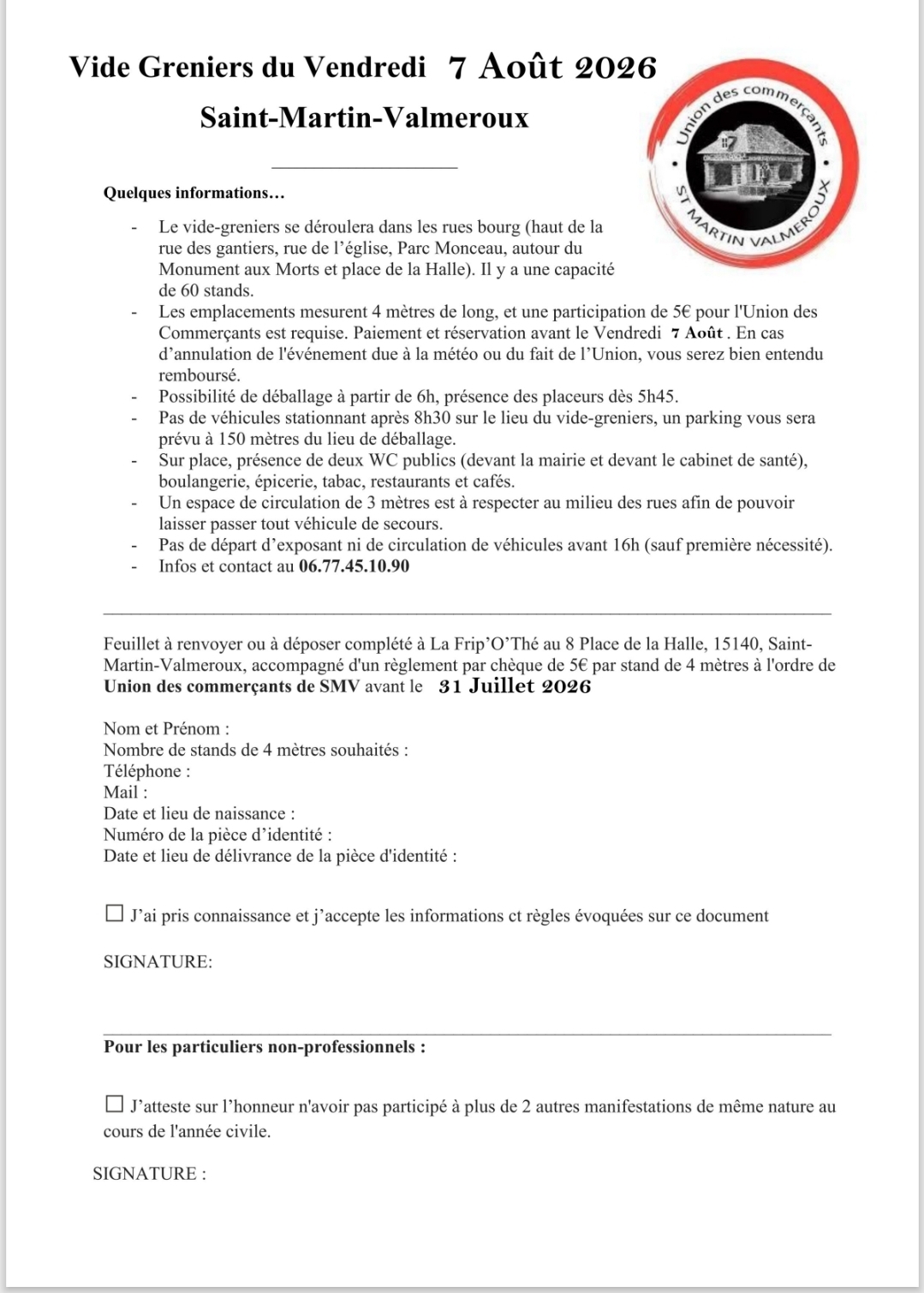 Vide-grenier annuel, réparti dans le bourg du village. Tous commerces et services à proximité : boulangerie, epicerie, tabac/presse, bar/restaurant, toilettes publiques et parking. Organisé le jour du marché hebdomadaire.