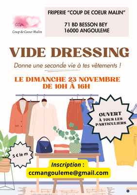 La friperie organise un vide-dressing ouvert à tous les particuliers de 10h à 16h. Inscription : 5 € le ml - installation à partir de 9h15 - le matériel pour exposer (table, chaise, portant ...) n'est pas fourni - réservation obligatoire (facebook, instagram, mail ou directement à la boutique)