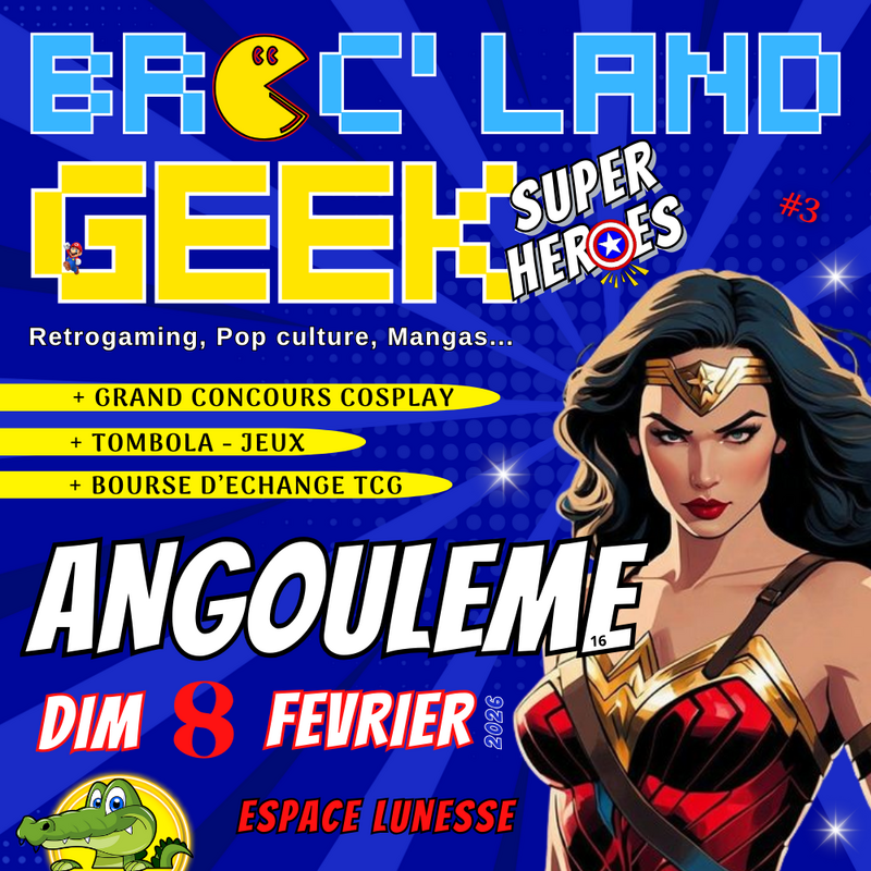 Ne manquez pas l'evènement broc' land geek - angouleme 2026 le dimanche 8 fevrier 2026... . Durant cette journée, ce salon rassemble de nombreux exposants venus de toute la région et des régions limitrophes sur une surface de 1000 m², dont l’objectif est de vendre, d’échanger ou de partager leur passion : jeux vidéo, pop culture, jouets vintage, lego, playmo, univers steampunk, jeux de rôle, héros, fantasy, sciences fiction, monde imaginaire, figurines, mangas, consoles de salon, miniatures, skylanders, illustrations, décoration, cartes à jouer, pet-shop, comics, bandes dessinées, jeux de société, livres de sf, fantastique, dvd, films cultes, jeux de cartes, goodies de séries tv actuelles et rétro, etc... . Lieu : espace lunesse rue paul mairat 16000 angouleme . Horaires : 9h - 17h . Nombreuses animations : . *** grand concours like my cosplay *** chaque candidat inscrit avant le 5 février 2026 recevra une invitation au blg et devra récolter dans les allées du salon un maximum de likes. Le vote du public et uniquement le vote du public sera pris en compte par le nombre de mentions "j'aime" via un qr code (afficher sur le salon). Le grand gagnant sera annoncé le dimanche à 16h et remportera un trophée et un bon d'achat de 100 euros à dépenser au salon. Formulaire d'inscription pour les cosplays : https://forms.gle/FsidXe48sWvCaitg7 lien du concours facebook : https://www.facebook.com/events/1127835612516393/ . *** jeu concours pass*** avec ton pass coupe file participe au jeu-concours et tu auras peut-être la chance de gagner 1 console de jeu rétrogaming... - tirage au sort à 16h30 - achat billetterie uniquement sur weezevent : https://my.weezevent.com/ANGOULEME2026 si absent lors du tirage, le lot vous sera envoyé en colis suivi. . *** combat des blasons *** choisis ton blason en arrivant sur le site du blg avec ton téléphone portable et accomplis des défis, quêtes et épreuves pour gagner des points de prestige... Le blason ayant accumulé de plus de points le dimanche à 16h sera proclamé vainqueur du tournoi des blasons. . *** bourse d'echange tcg (trading card game) *** ce sera l'occasion parfaite de partager, compléter votre collection et rencontrer d'autres passionnés dans un espace dédié aux cartes : pokémon - dragon ball - one piece - lorcana - yu gi oh - magic - altered - etc... . Buffet - buvette . Billetterie sur place : 3 €uros gratuit pour les -10 ans et pmr . Pre-vente pass coupe file + jeu concours : 4 €uros "offre jusqu'au 8 janvier 2026" entrée sans file d'attente et participe au jeu-concours pour gagner 1 display. Achat billetterie uniquement sur weezevent https://my.weezevent.com/ANGOULEME2026 . Pass coupe file + jeu concours : 6 €uros entrée sans file d'attente et participe au jeu-concours pour gagner 1 console de jeu rétrogaming. Achat billetterie uniquement sur weezevent https://my.weezevent.com/ANGOULEME2026 . Pass coupe file family + jeu concours : 20 €uros 2 adultes + 2 enfants entrée sans file d'attente et participe au jeu-concours pour gagner 1 console de jeu rétrogaming. Achat billetterie uniquement sur weezevent https://my.weezevent.com/ANGOULEME2026 . Pass culture tarif pass coupe file : 6 €uros entrée sans file d'attente réservations "duo" acceptées https://passculture.app/offre/369668360 . Pass vip - accès avant ouverture officielle : 25 €uros entrée déballage marchand - donne accès avant l'ouverture officielle au public pendant l'installation des exposants le samedi de 16h à 19h et dimanche de 7h à 17h achat billetterie uniquement sur weezevent https://my.weezevent.com/ANGOULEME2026 . Organisation : tandem events france https://www.tandem-events.fr/ .