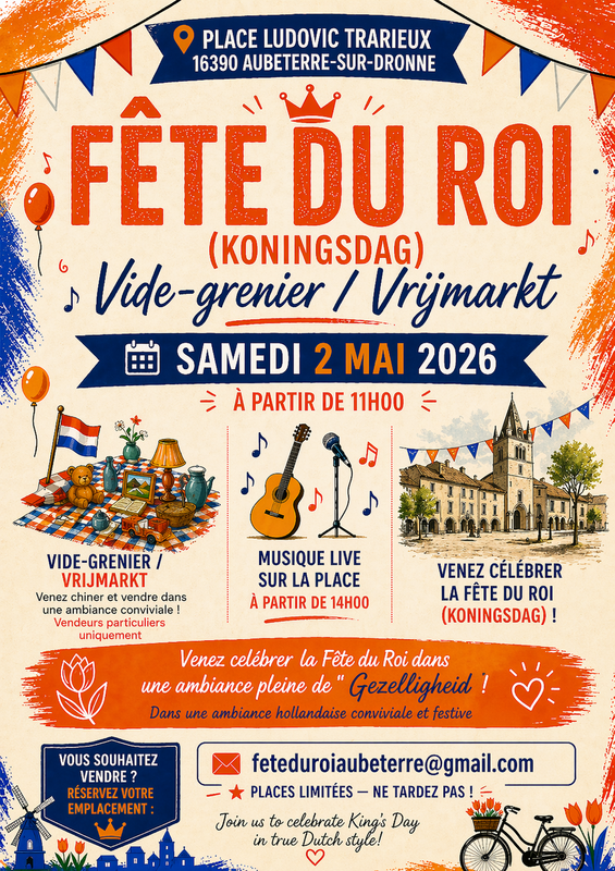 Venez célébrer la fête du roi (koningsdag) à aubeterre-sur-dronne !