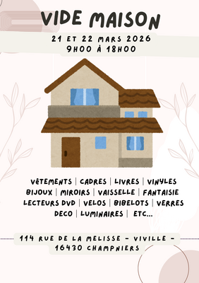 Cause départ fin mars, vide maison organisé samedi 21 et dimanche 22 mars 2026 de 9h00 à 18h00.