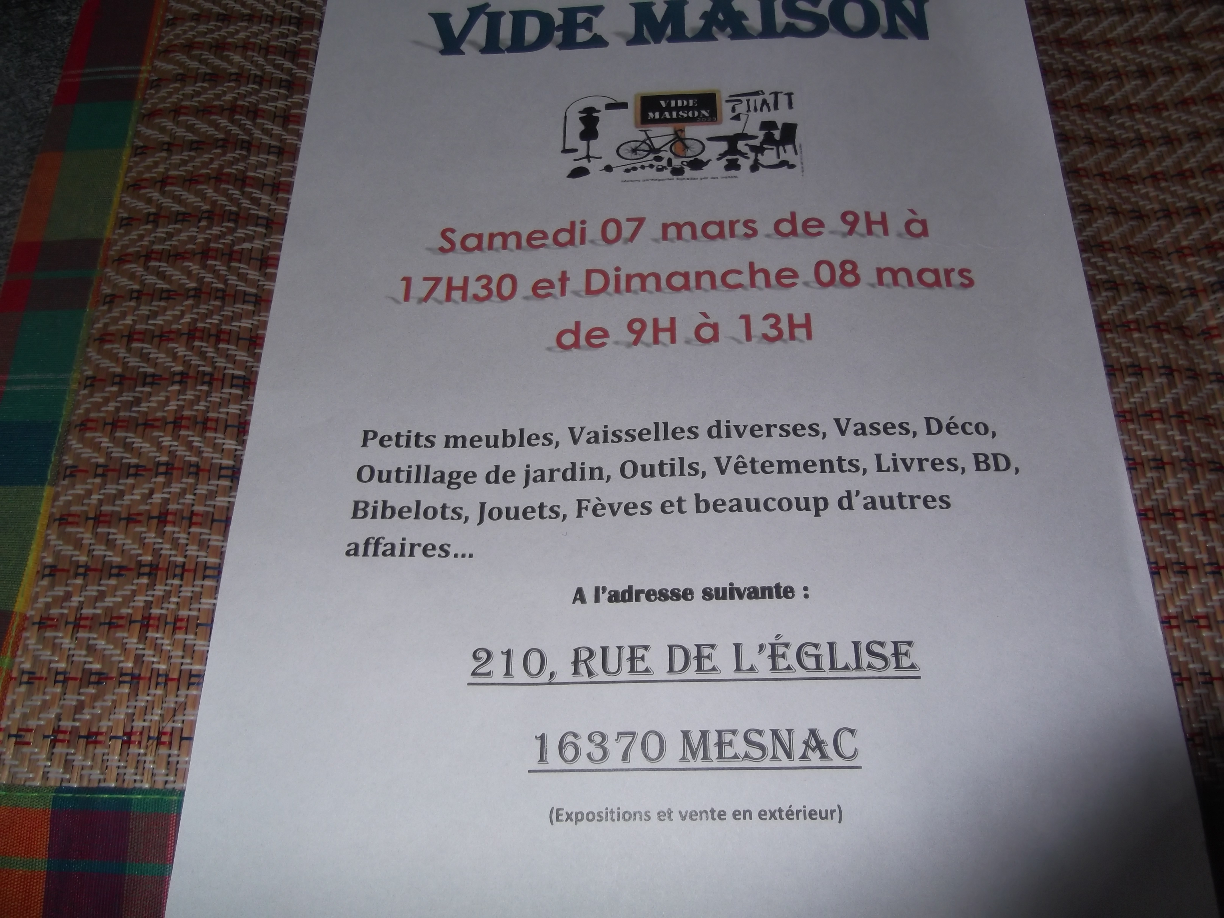 Vide maison petits meubles,vaisselles divers,vases ,déco,outillages de jardin,vétements,livres et bd ;bibelots ,de la poterie ,jouets, féves il y à beaucoup d autres affaires on vous attend nombreux horaire du samedi 9h à 17h30 et dimanche de 9h à 13h