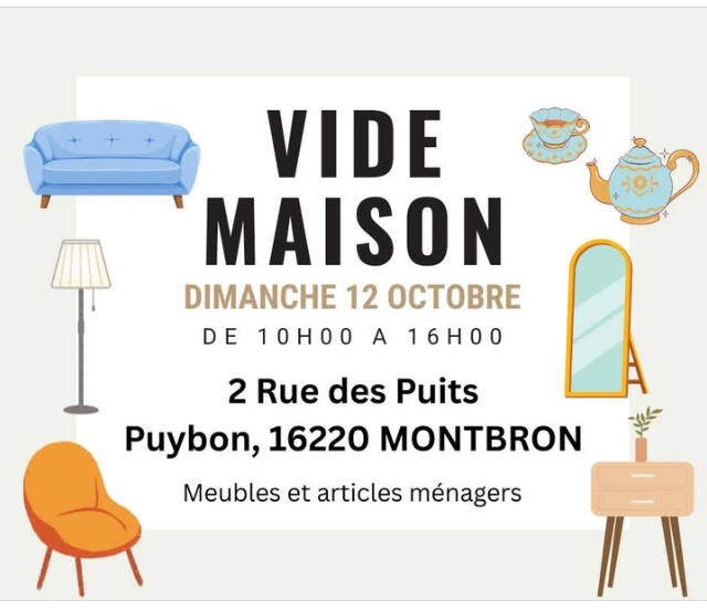 Vide-maison suite à un déménagement. Meubles, objets d'art, ustensiles de cuisine, vaisselle, objets de décoration, miroirs, services de table, linge de maison et articles de jardin sont à vendre.