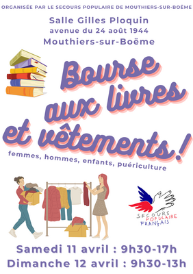 Le secours populaire de mouthiers sur boeme organise une bourse aux vêtements et aux livres.