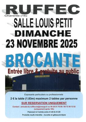 Tables fournies. 2€la table (1.83m) maximum 2 tables par personnes. Réservation obligatoire réservation soit : - par mail : - par téléphone apres 18h uniquement