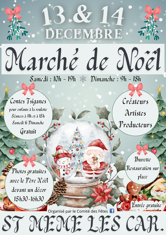 Marché de noël en intérieur avec une vingtaine de créateurs & producteurs : bijoux, miel, bois, décoration, fleurs, bougies, coutures maison & habillement, sacs, objets personnalisables ..... Contes tsiganes à la roulotte pour les enfants, gratuits. Photos avec le père noël devant un décor (gratuit, par vous même). Buvette & restauration sur place.