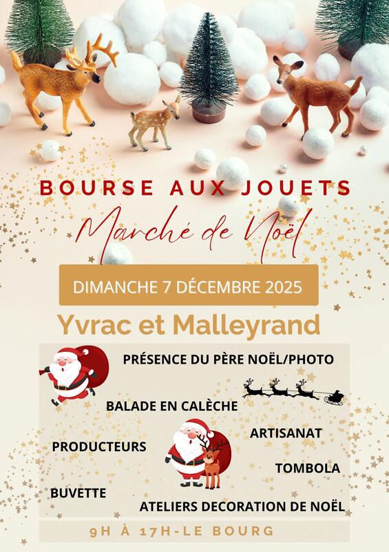 Marché de noël le dimanche 7 décembre 2025 avec producteurs et artisans locaux, bourse aux jouets, dans le joli bourg d'yvrac et malleyrand l