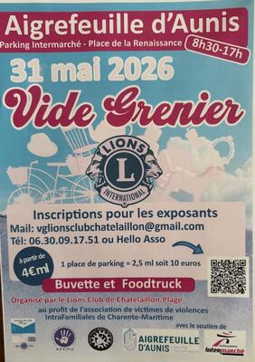 Vide grenier organisé par le lions club de châtelaillon-plage, le 31 mai 2026, sur le parking d'intermarché d'aigrefeuille d'aunis.