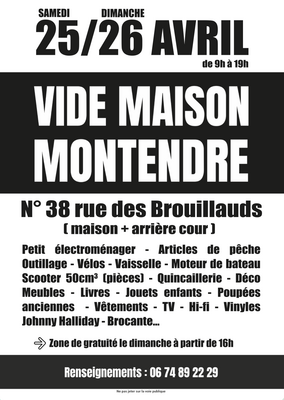 Rendez-vous au 38 rue des brouillauds à montendre (parking de la poste) pour un vide maison sur 2 jours, de 9h à 19h.