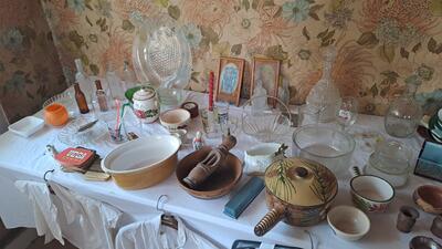 Tables, meubles, vaisselles, linge, vêtements objets divers. Blutoir, coffre d'horloge comtoise, armoire à pharmacie, table en bois, anciens plats de service faïence,ancienne herse, ancienne décavaillonneuse etc...