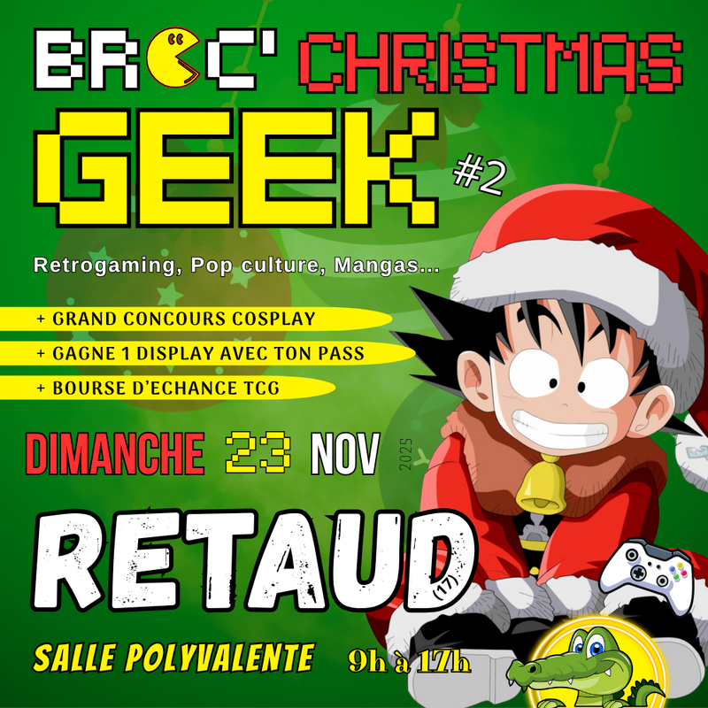 Ne manquez pas l'evènement broc' christmas geek - retaud 2025 le dimanche 23 novembre 2025... . A 10 mn de saintes et 30 mn de royan (17). . Durant cette journée, dans une ambiance noël, ce salon rassemble de nombreux exposants venus de toute la région et des régions limitrophes sur une surface de 800 m², dont l’objectif est de vendre, d’échanger ou de partager leur passion : jeux vidéo, pop culture, jouets vintage, lego, playmo, univers steampunk, jeux de rôle, héros, fantasy, sciences fiction, monde imaginaire, figurines, mangas, consoles de salon, miniatures, skylanders, illustrations, décoration, cartes à jouer, pet-shop, comics, bandes dessinées, jeux de société, livres de sf, fantastique, dvd, films cultes, jeux de cartes, goodies de séries tv actuelles et rétro, etc... . Lieu : salle polyvalente route de thénac 17460 retaud . Horaires : dimanche de 9h à 17h . Nombreuses animations : . Grand concours like my cosplay chaque candidat inscrit avant le 21 novembre recevra une invitation au blg et devra récolter entre 9h et 15h45 un maximum de likes. Le vote du public sera pris en compte par le nombre de mentions "j'aime" via un qr code (afficher sur le salon). Le grand gagnant sera annoncé à 16h et remportera un trophée et un bon d'achat de 100 euros à dépenser au salon. Jeu concours display avec ton pass coupe file participe au jeu-concours et tu auras peut-être la chance de gagner 1 display pokémon... - tirage au sort à 16h30 - achat billetterie uniquement sur weezevent : https://my.weezevent.com/RETAUD2025 si absent lors du tirage, le lot vous sera envoyé en colis suivi. . Bourse d'echange tcg (trading card game) ce sera l'occasion parfaite de partager, compléter votre collection et rencontrer d'autres passionnés dans un espace dédié aux cartes : pokémon - dragon ball - one piece - lorcana - yu gi oh - magic - altered - etc... . Food - buffet - buvette . Billetterie sur place : 3 €uros gratuit pour les -10 ans et pmr . Pre-vente pass coupe file + jeu concours : 4 €uros "offre jusqu'au 23 octobre 2025" entrée sans file d'attente et participe au jeu-concours pour gagner 1 display. Achat billetterie uniquement sur weezevent https://my.weezevent.com/RETAUD2025 . Pass coupe file + jeu concours : 6 €uros entrée sans file d'attente et participe au jeu-concours pour gagner 1 display. Achat billetterie uniquement sur weezevent https://my.weezevent.com/RETAUD2025 . Pass coupe file family + jeu concours : 20 €uros 2 adultes + 2 enfants entrée sans file d'attente et participe au jeu-concours pour gagner 1 display. Achat billetterie uniquement sur weezevent https://my.weezevent.com/RETAUD2025 . Pass vip - accès avant ouverture officielle : 25 €uros entrée déballage marchand - donne accès avant l'ouverture officielle au public pendant - achat billetterie uniquement sur weezevent https://my.weezevent.com/RETAUD2025 . Organisation : tandem events france https://www.tandem-events.fr/ . Renseignements : infoline .